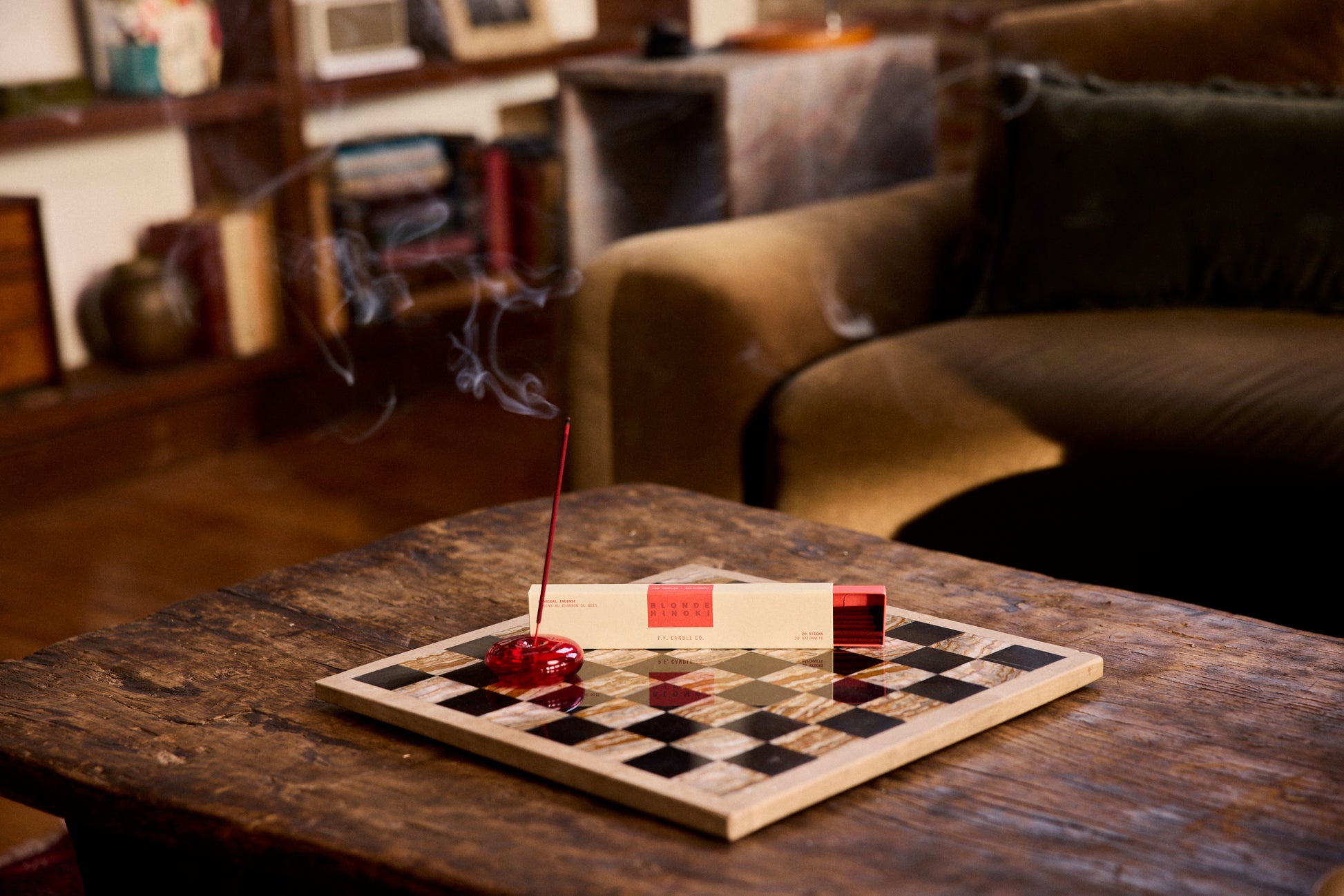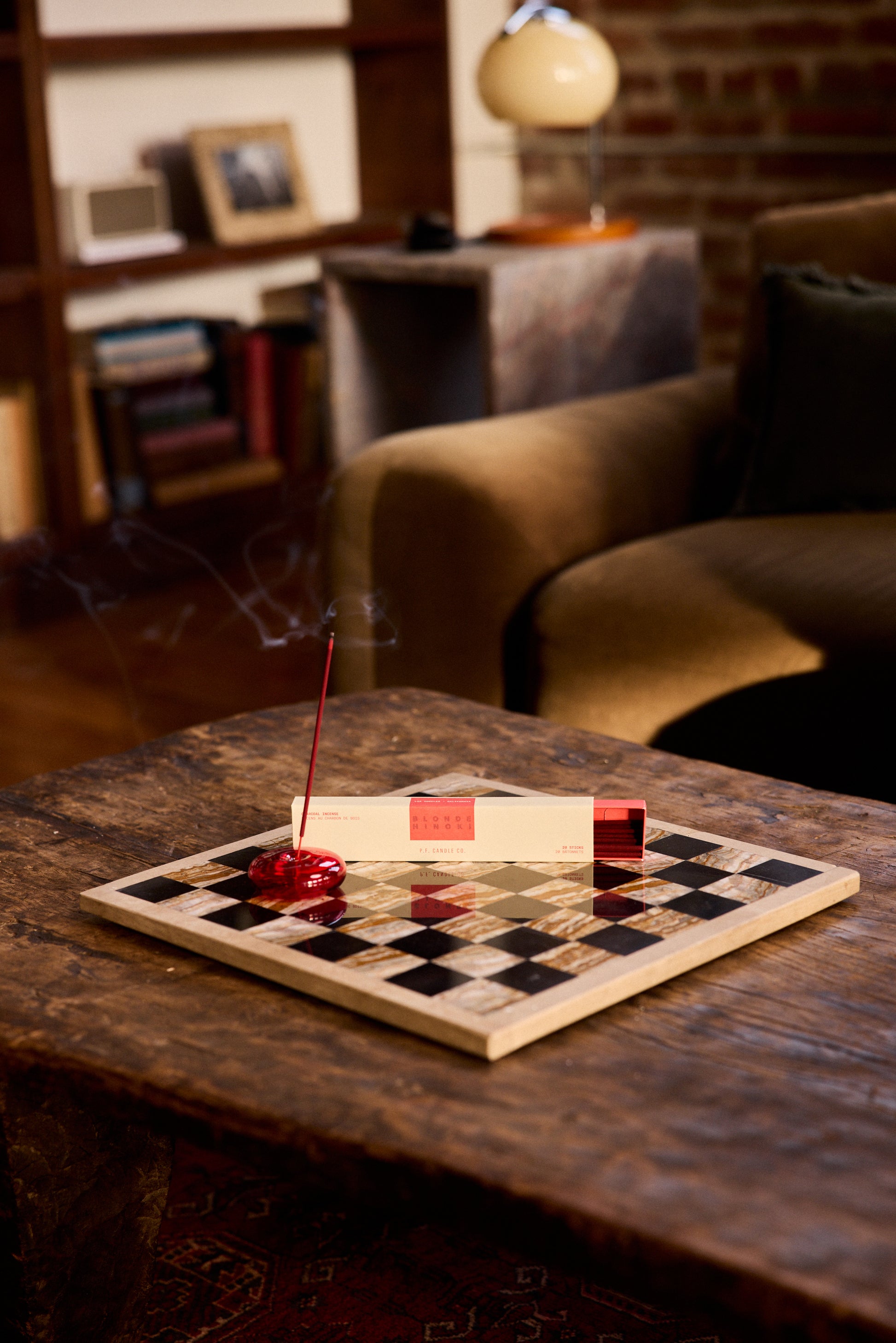 Twenty vermillion-hued charcoal incense sticks, dipped in California and packed by hand in premium paper drawer-style boxes.